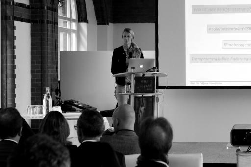An diese Analyse konnte Professor Dr. Tatjana Oberdörster in ihrem Vortrag über gesetzliche Anforderungen zur Umsetzung der CSR-Richtlinie anschließen. Für sie steht fest, das Ziel des Geschäftsberichts bleiben die Analysten und Shareholder.
