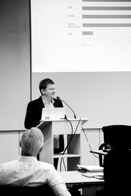 Wie wird sie sich in Zukunft kommunikativ und visuell verändern? Mit diesen Fragen beschäftigt sich das CCI auch, und zwar im Rahmen seines kleinen Forschungslabors, des CCI-LAB. Einen Einblick in die Themen, die das CCI-Lab bewegt, gab es im letzten Block des Heidelberger Forums. So stellte Gisela Grosse an Beispielen aktueller Geschäftsberichte vor, wie sich ›Nachhaltigkeit‹ in Geschäftsberichten über Kommunikation und Gestaltung, z. B. Informationsgrafik, materialisiert.