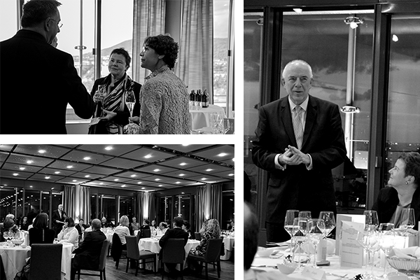 Am späten Nachmittag ging ein intensiver erster Tagungstag zu Ende. Kurz blieb den Teilnehmern Zeit, zu verschnaufen und das Gelernte zu verarbeiten – bevor man sich am Abend zum Gala-Dinner wiedertraf. Während die Sonne unterging, ging es für die Gäste hinauf in den 12. Stock der Print Media Academy. Zu Sekt und Häppchen und einem Panorama von Heidelberg, das nach und nach erleuchtet wurde. Frau Grosse hatte das Vergnügen, den Teilnehmerinnen und Teilnehmern den diesjährigen Ehrengast vorzustellen, Prof. Christian Strenger. Christian Strenger, glühender Verfechter von Corporate Governance, Gründer internationaler Kodizes und Träger des Bundesverdienstkreuzes, mahnte in seiner Dinnerspeach eindrücklich: »Integriertes Reporting erfordert integriertes Denken.«