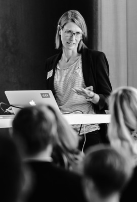 Mit gewohnt geballter Ladung an Statistik und Bildbeispielen präsentierte Prof. Gisela Grosse, wissenschaftliche Leiterin des CCI, die Ergebnisse der diesjährigen Analyse der DAX 30-Geschäftsberichte. Dabei ging es zunächst um Zahlen, Daten, Fakten rund um das Reporting. Wie viele Print- und Onlineberichte gibt es überhaupt? In welchen Formaten sind Onlineberichte aufbereitet? In welcher Form kommen die Unternehmen ihrer Verpflichtung zu einer ›Nichtfinanziellen Erklärung‹ nach? Wie viele Unternehmen haben ein Jahresmotto? Welche Schriften werden verwendet?
